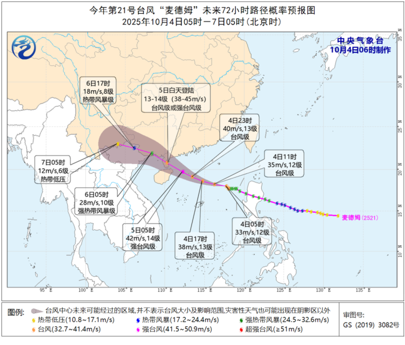 大风预报:4日08时至5日08时,巴士海峡、南海北部和中部海域、东沙群岛、西沙群岛、中沙群岛及黄岩岛附近海域、北部湾中东部、琼州海峡、广西沿海、广东西南部及沿海、海南岛及沿海、台湾岛南部沿海有5-7级、阵风8-10级的大风,其中,南海西北部海域、琼州海峡、广东西部沿海、海南岛东部和北部沿海的风力有8-11级,阵风12-13级,“麦德姆”中心经过的附近海域或地区风力可达12-14级,阵风15-16级。