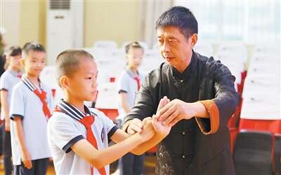 四川乐山市文化馆利用地方文化资源,邀请国家级非物质文化遗产峨眉武术代表性传承人王超给学生讲解动作要领。