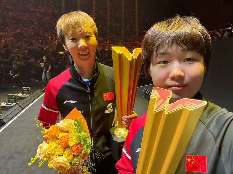 蒯曼(前)/王曼昱夺得本次比赛女双冠军后自拍。WTT世界乒联供图