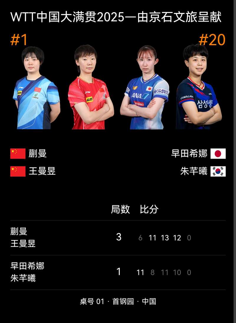 “双曼”组合逆转获胜,夺得WTT中国大满贯女双冠军
