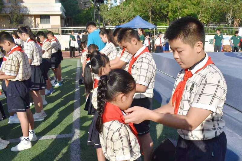 活动伊始,五地少先队员“云端”相见,共唱国歌,齐唱队歌。随后的入队仪式中,在中共党员、共青团员、家长和少先队员代表的共同见证下,线上线下共1803名新队员戴上鲜艳的红领巾,光荣地加入了少先队。