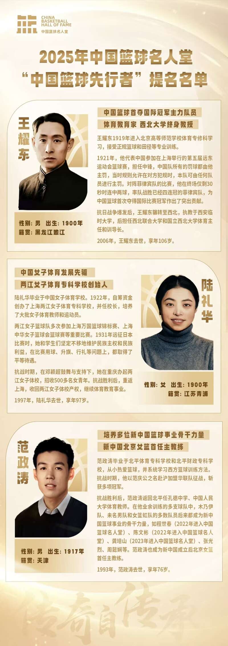 中国青年报客户端讯(中青报·中青网记者杨屾)10月11日,中国篮球名人堂“中国篮球先行者”提名名单正式确定,王耀东、陆礼华、范政涛三位进入提名名单。