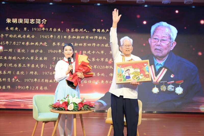 尾声,红色薪火在互动中传递。“跟着旗帜学成长”红色基因微讲堂,用小故事讲好大道理,引导少年读懂旗帜里的初心。活动特邀95岁抗战老兵朱明庚到场,向少先队员分享抗战故事。