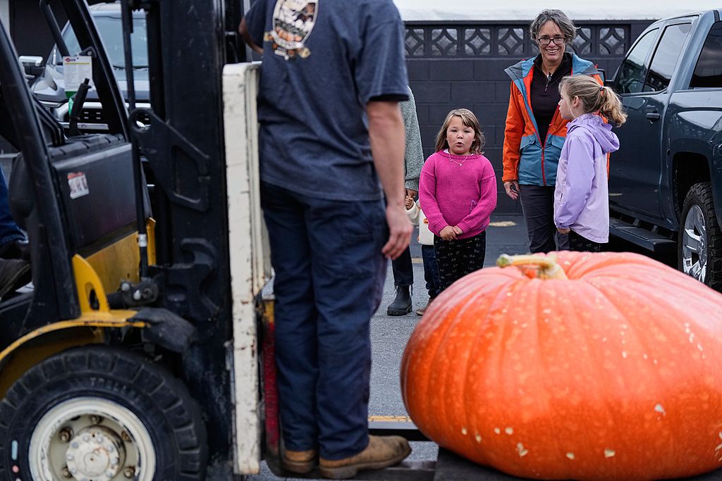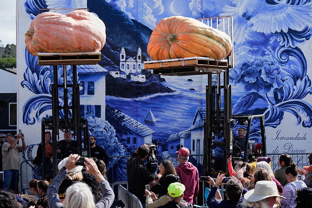 当地时间2025年10月13日,美国加利福尼亚州半月湾,第52届世界冠军南瓜称重赛上,一个巨型南瓜被叉车搬运。