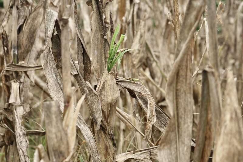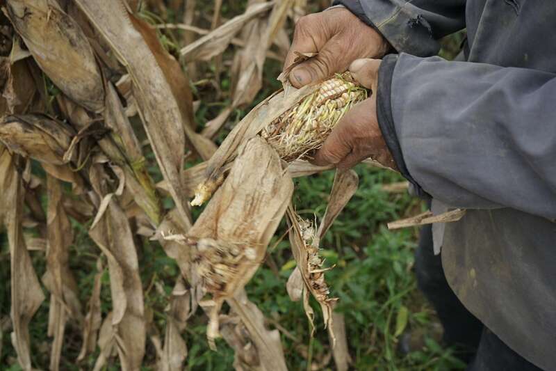 10月10日,河南桐柏,一块玉米地里的玉米早已成熟,但并未收割,有玉米棒子在玉米秆上发芽了。中青报·中青网记者 李强/摄