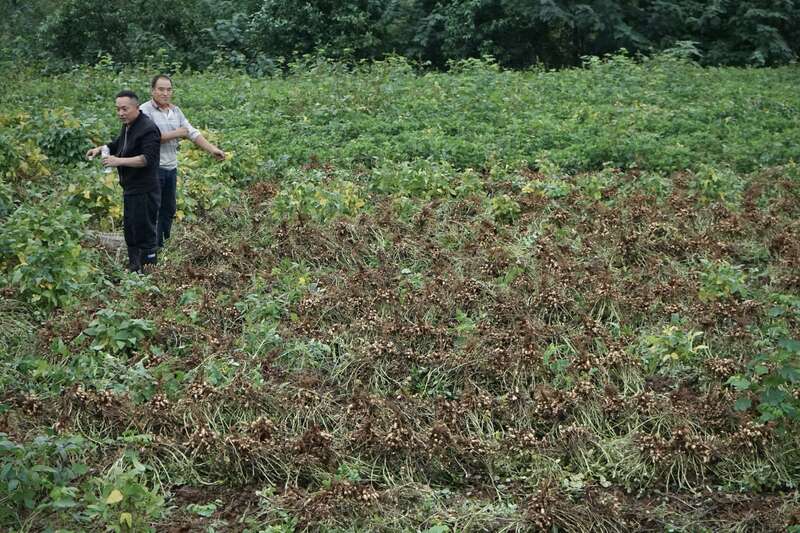 10月11日,河南桐柏,农民在连阴雨的间歇期薅花生,为防出芽,花生“屁股朝天”地摆放在地里。中青报·中青网记者 李强/摄