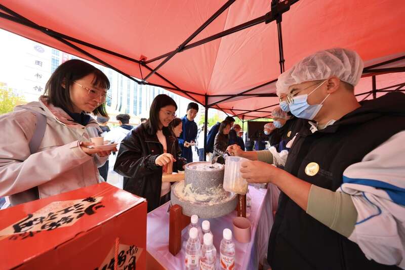活动最热闹的环节当属非遗体验。在王致和腐乳酿造技艺的传承人与研发人员的指导下,师生们亲手参与磨浆、点卤制坯、搓毛、灌汤等制作工序。生物学院一名老师体验后说:“从大豆到腐乳的发酵过程,蕴含丰富的微生物学知识,这既是一堂非遗传承课,又是一次生动的专业实践。”