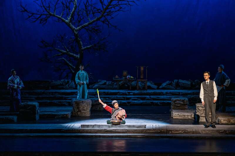 故事中的“烟火气”,则体现在两处舞台设置上:其一是垂下的纱帘幕展现出各种城市风貌与相关故事元素,其二是在舞台上打造了一棵高大的树。