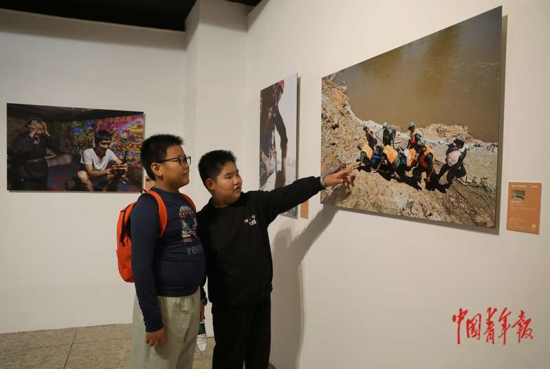 10月18日,北京中华世纪坛,北京国际摄影周2025之“佳能CPS会员摄影展”展览现场,两位小朋友在观看一幅反映今年北京北部山区洪涝灾害救援现场的照片。中青报·中青网记者 陈剑/摄