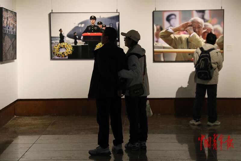 10月18日,北京中华世纪坛,北京国际摄影周2025之“中国新闻摄影精品巡展”展览现场,观众在致敬英雄的图片墙前驻足。中青报·中青网记者 陈剑/摄