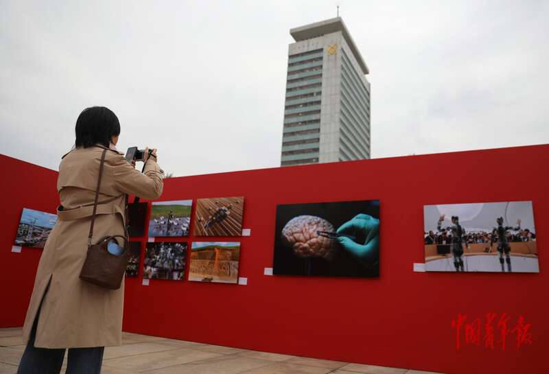 10月18日,北京中华世纪坛,北京国际摄影周2025之“全国主流媒体新闻摄影展”展览现场,参观者在反映科技和生态的图片墙前驻足拍摄。中青报·中青网记者 陈剑/摄