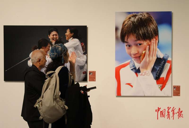10月18日,北京中华世纪坛,北京国际摄影周2025之“佳能CPS会员摄影展”展览现场,观众在观看巴黎奥运会上全红婵夺冠的照片。中青报·中青网记者 陈剑/摄