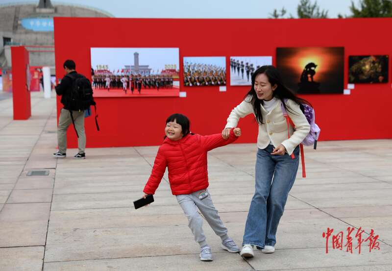 10月18日,北京中华世纪坛,北京国际摄影周2025之“全国主流媒体新闻摄影展”展览现场,一位母亲带着孩子穿梭在九三阅兵主题的图片展区。中青报·中青网记者 陈剑/摄
