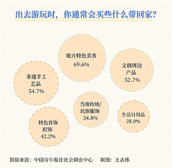 原汁原味的特色美食、复刻当地标志性建筑的文创产品、精美的非遗手工艺品……如今,越来越多城市开始打造属于本地的特色礼物,这些特色礼物成为不少游客的“心头好”,被当作伴手礼带回家。去一座城市游玩,你会选择带什么回家?日前,中国青年报社社会调查中心联合问卷网(wenjuan.com),对1001名受访者进行的一项调查显示,地方特色美食是受访者最爱购买的产品,另外,非遗手工艺品和文创周边产品也是大家常买的类型。85.4%的受访者认同“特色的城市伴手礼,就是一张流动的文化名片”。
