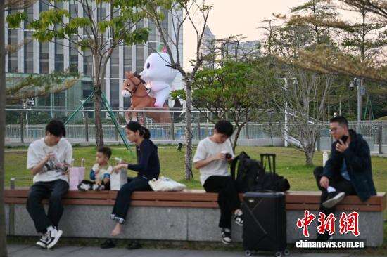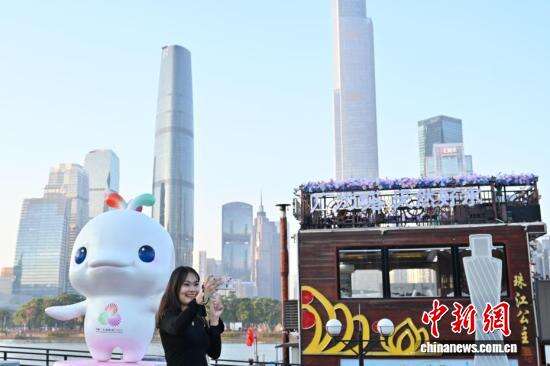10月26日,广州市海珠区广州塔财富码头的十五运会和残特奥会吉祥物“喜洋洋”吸引游客拍照。