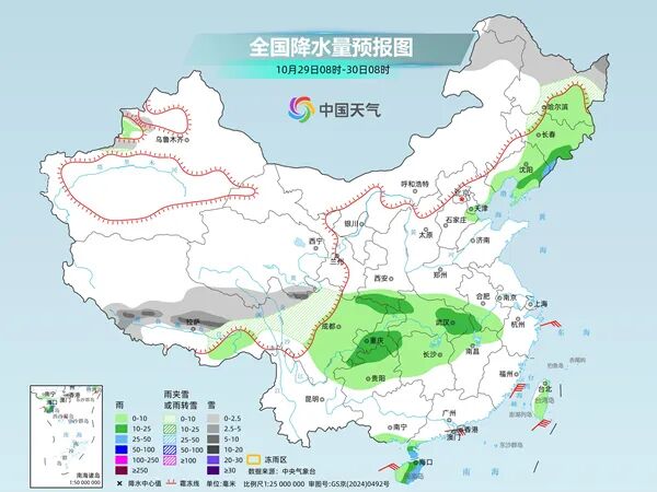 中央气象台预计,今天,新疆北疆北部、黑龙江中东部、西藏西南部等地部分地区有小雪或雨夹雪,其中,黑龙江北部等地部分地区有中到大雪。海南岛、台湾岛大部等地部分地区有中到大雨,其中,海南岛南部等地部分地区有暴雨。