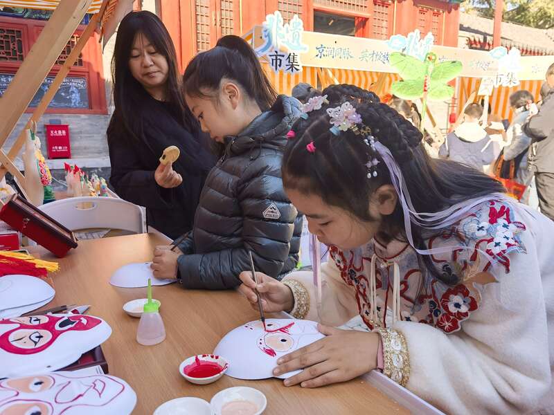 10月26日,北京什刹海,非遗市集上,小朋友们在学画京剧脸谱。当日一场来自北京与江苏镇江的非遗体验活动在这里举行,观众沉浸式领略两地非遗风采。当日正值周末,活动现场吸引了不少青少年前来参观和体验。李庚伟/摄