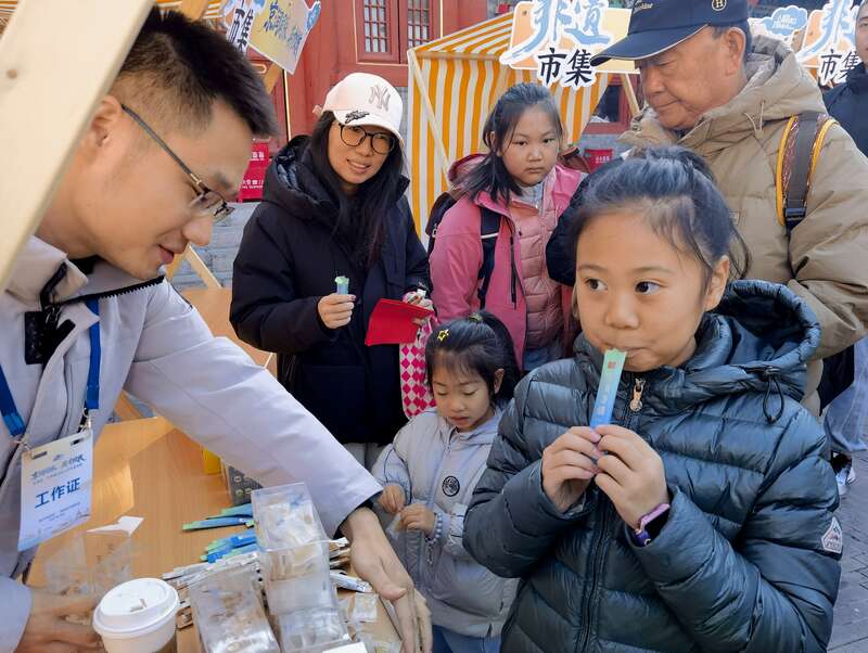 10月26日,北京什刹海,非遗市集上,一名小朋友在品尝来自镇江的恒顺香醋。据介绍,镇江恒顺香醋酿制技艺是国家级非物质文化遗产。当日,北京什刹海风景区与镇江西津渡历史文化街区签署人才联合培养与交流框架协议,探索人才交流与产业合作的文旅融合路径。李庚伟/摄