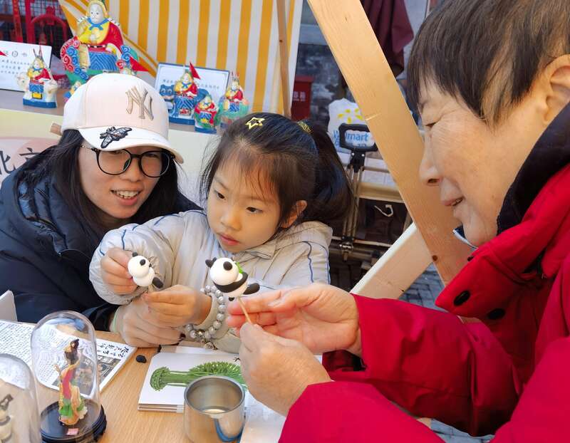 10月26日,北京什刹海,非遗市集上,一名小朋友在面塑艺人指导下学捏熊猫。李庚伟/摄