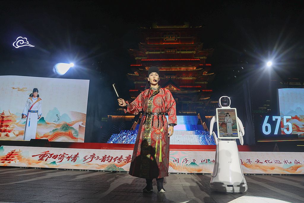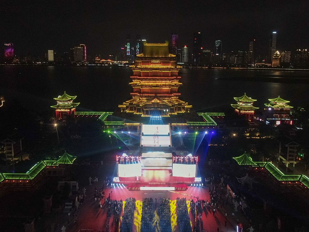 2025年10月29日,江西南昌东湖区,重阳寄情·《序》韵传新——《滕王阁序》问世1350周年文化巡礼盛典在“江南名楼”滕王阁举行。公元675年,王勃写下《滕王阁序》,距今正好1350周年。本次晚会以“声、光、舞”巧妙活化盛唐风骨,包括舞蹈、歌曲、快板说唱、诵读《滕王阁序》等节目。图为航拍盛典现场。(无人机照片) 中新社记者 刘力鑫 摄