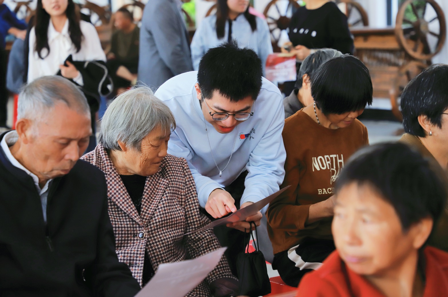 演出前,志愿者为老人介绍节目单上的演出信息。浙江工商大学供图