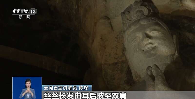 这里有一尊让人过目难忘的菩萨造像。云冈石窟讲解员陈琛介绍,菩萨是细眉长目、柳叶弯眉,有两个小酒窝,八颗牙齿也是显露在外的。花冠雕刻得非常精美,头戴半月花冠,丝丝长发由耳后披至双肩,非常美观匀称。脸部形态塑造很饱满,细节设计的棱角感也非常清晰,而且这也是云冈石窟唯一一尊露着牙齿的菩萨。