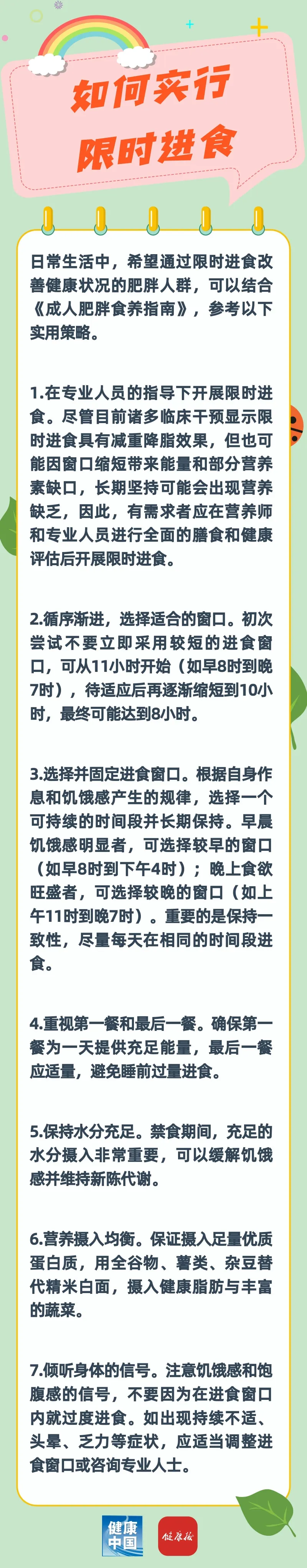 尽管限时进食有助于改善代谢健康、稳定血糖、提升精力、改善睡眠质量,但是限时进食并非适合所有人。对于没有减重需求的普通人,限时进食若实践不当,可能带来一些不良影响,如窗口期过短或进食不足,可能导致能量缺乏、疲劳;过分严格的时间限制,还可能带来心理压力。