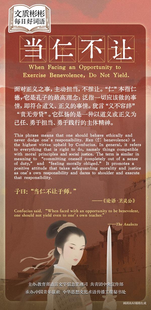 This phrase means that one should behave ethically and never dodge one's responsibility. Ren(仁 benevolence) is the highest virtue upheld by Confucius. In general, it refers to everything that is right to do, namely things compatible with moral principles and social justice. The term is similar in meaning to "committing oneself completely out of a sense of duty," and "feeling morally obliged." It promotes a positive attitude that takes safeguarding morality and justice as one's own responsibility and dares to shoulder and execute that responsibility.