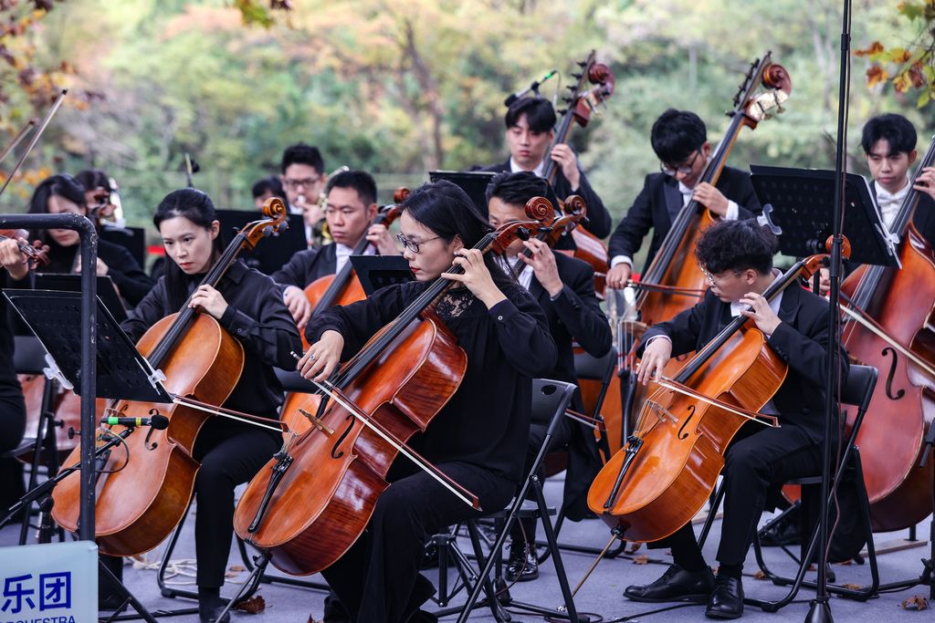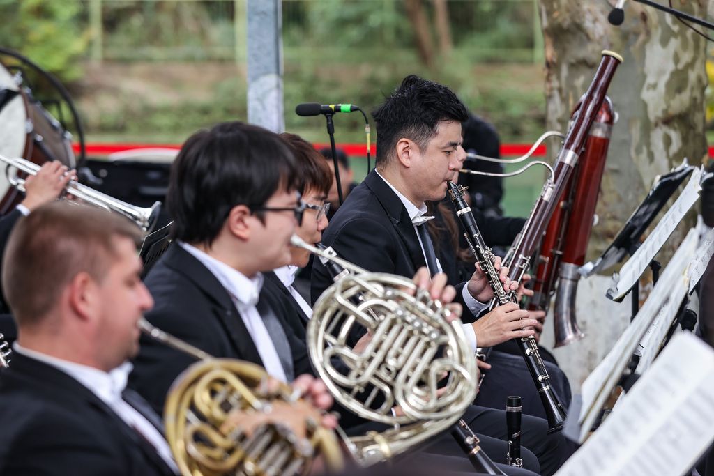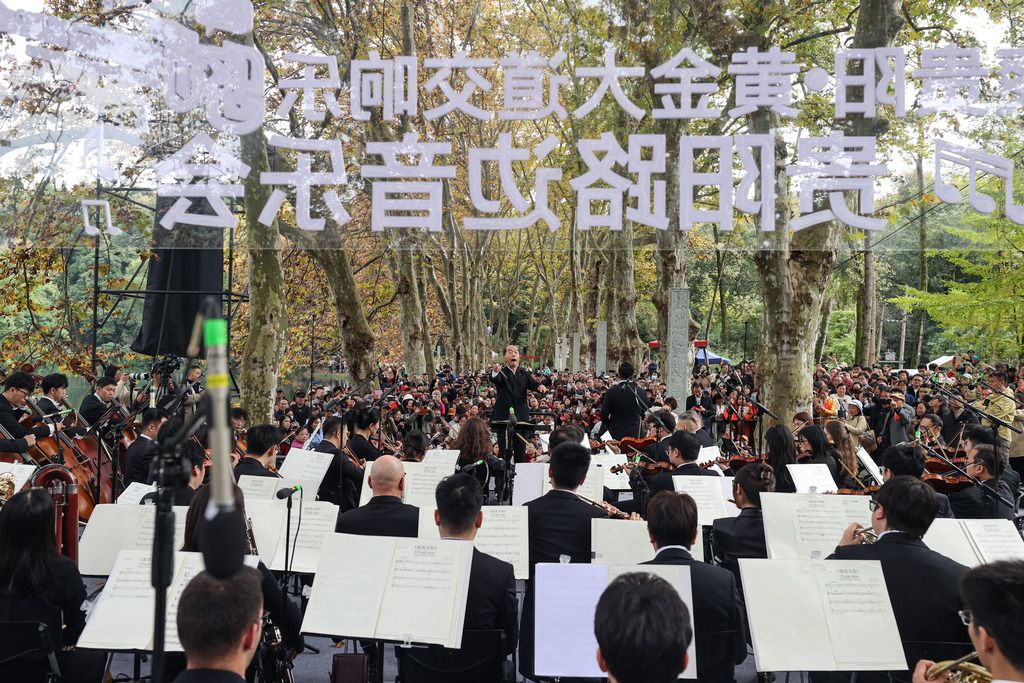 11月4日,贵阳交响乐团在贵州省贵阳市花溪区花溪河畔的“黄金大道”举行交响音乐会,演奏及演唱了多首耳熟能详的经典曲目,为现场观众带来一场户外视听盛宴。图为交响音乐会现场。 中新社记者 瞿宏伦 摄