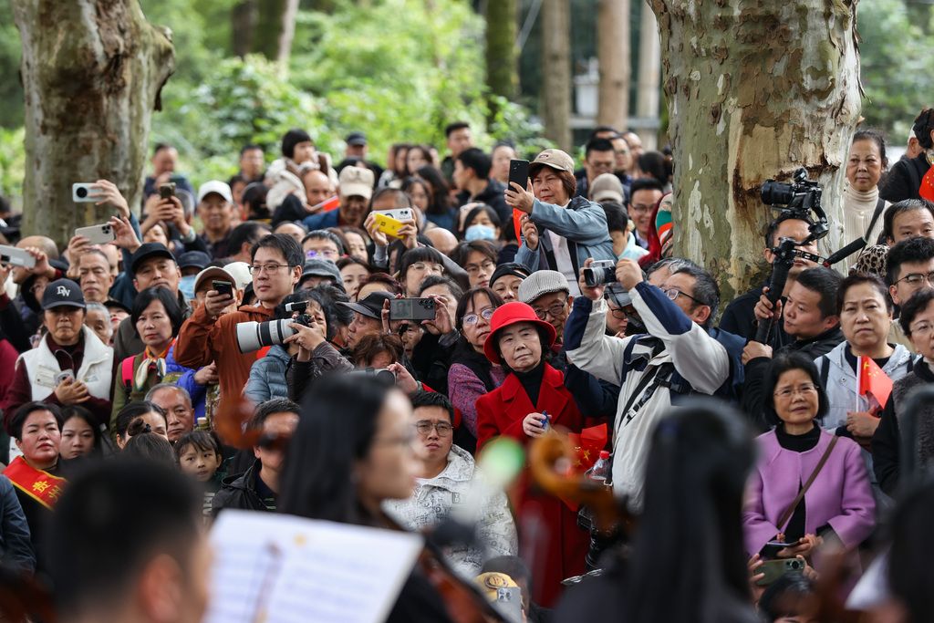 11月4日,贵阳交响乐团在贵州省贵阳市花溪区花溪河畔的“黄金大道”举行交响音乐会,演奏及演唱了多首耳熟能详的经典曲目,为现场观众带来一场户外视听盛宴。图为交响音乐会吸引观众。 中新社记者 瞿宏伦 摄