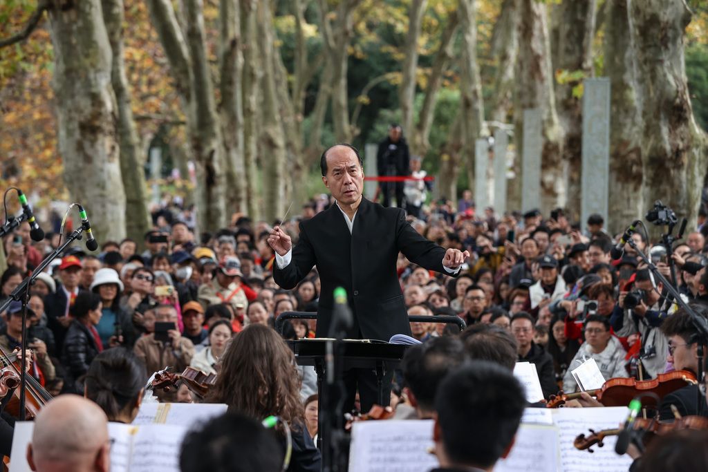 11月4日,贵阳交响乐团在贵州省贵阳市花溪区花溪河畔的“黄金大道”举行交响音乐会,演奏及演唱了多首耳熟能详的经典曲目,为现场观众带来一场户外视听盛宴。图为指挥家张国勇执棒贵阳交响乐团。 中新社记者 瞿宏伦 摄