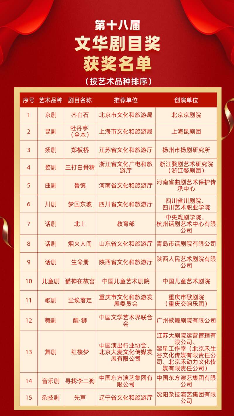 中国青年报客户端讯(中青报·中青网记者 李怡蒙)11月4日,由文化和旅游部、重庆市人民政府、四川省人民政府共同主办的第十四届中国艺术节在重庆闭幕,闭幕式上公布了第十八届文华奖获奖名单。