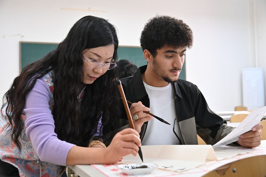 2025年11月4日,重庆沙坪坝,重庆建筑科技职业学院教师指导外国留学生练习书法。