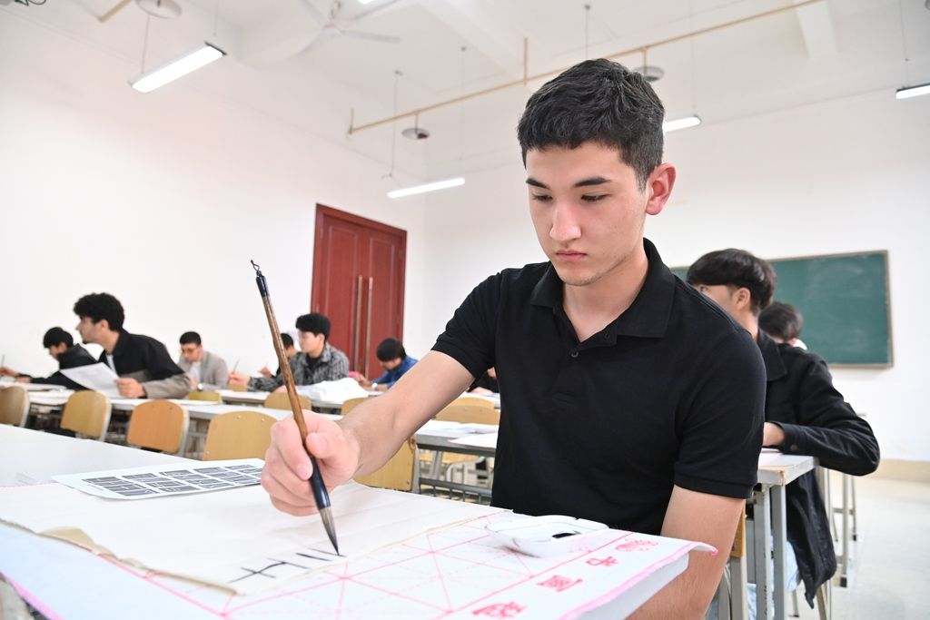2025年11月4日,重庆沙坪坝,外国留学生在重庆建筑科技职业学院学习书法。