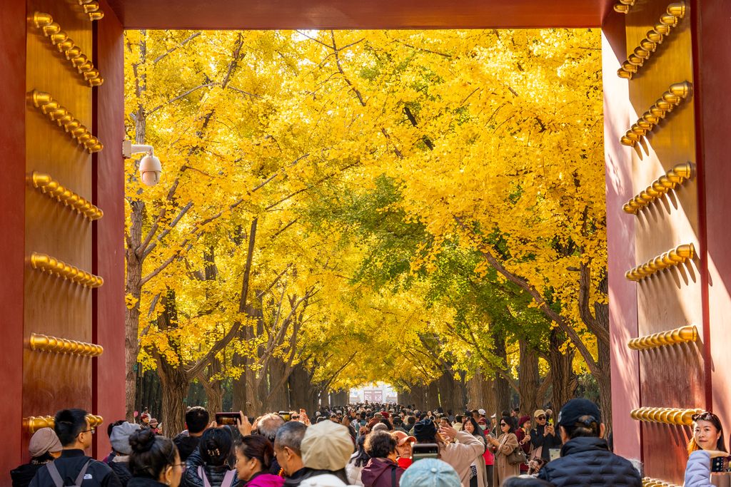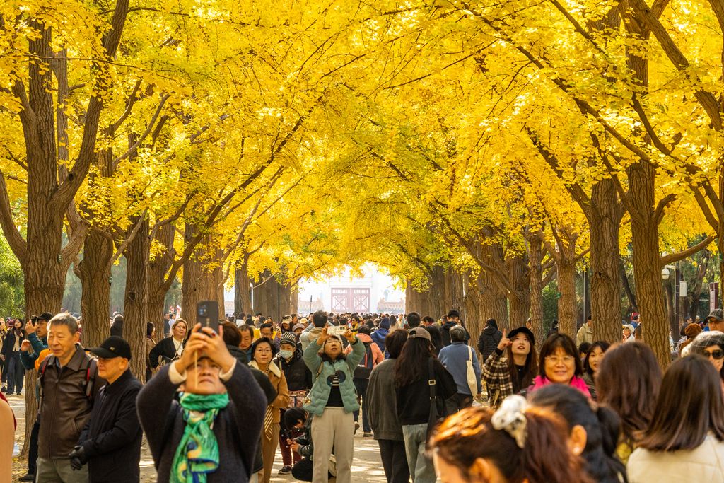 2025年11月4日,北京地坛公园,众多游客观赏银杏、打卡拍照。