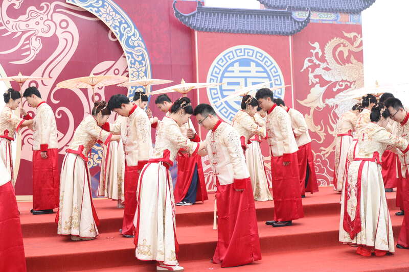 仪式现场,24对新人身着中式礼服,手持红绸,携手走过象征爱情与事业交融的三峡大坝水电工程模型桥梁,登上“幸福舞台”,共行三拜之礼、互换定情戒指、共饮柑橘合卺茶,仪式庄重典雅。