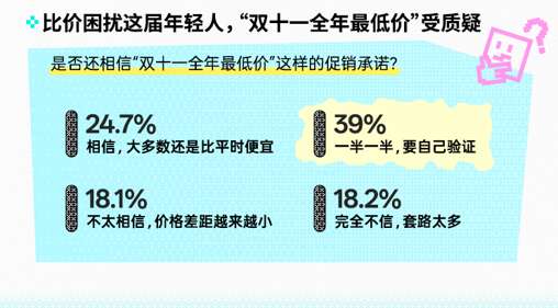 在是否还相信“双十一全年最低价”的选择上,近4成的被调查青年表示“一半一半,要自己验证”(39%)。