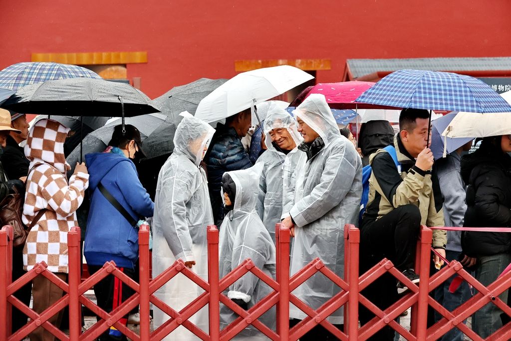 2025年11月7日,北京,立冬节气,北京开启降雨降温模式,游客冒雨游览故宫兴致不减。