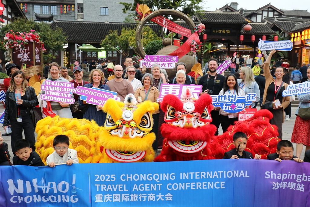 2025年11月5日,重庆沙坪坝区磁器口古镇,2025重庆国际旅行商大会踩线团成员合影留念。