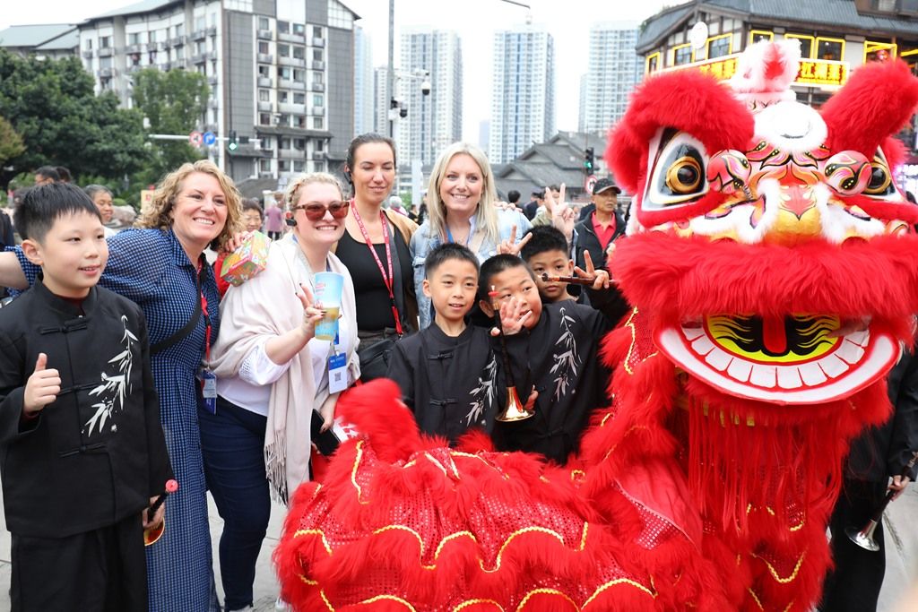 2025年11月5日,重庆沙坪坝区磁器口古镇,国际旅行商大会踩线团成员观看舞狮表演。
