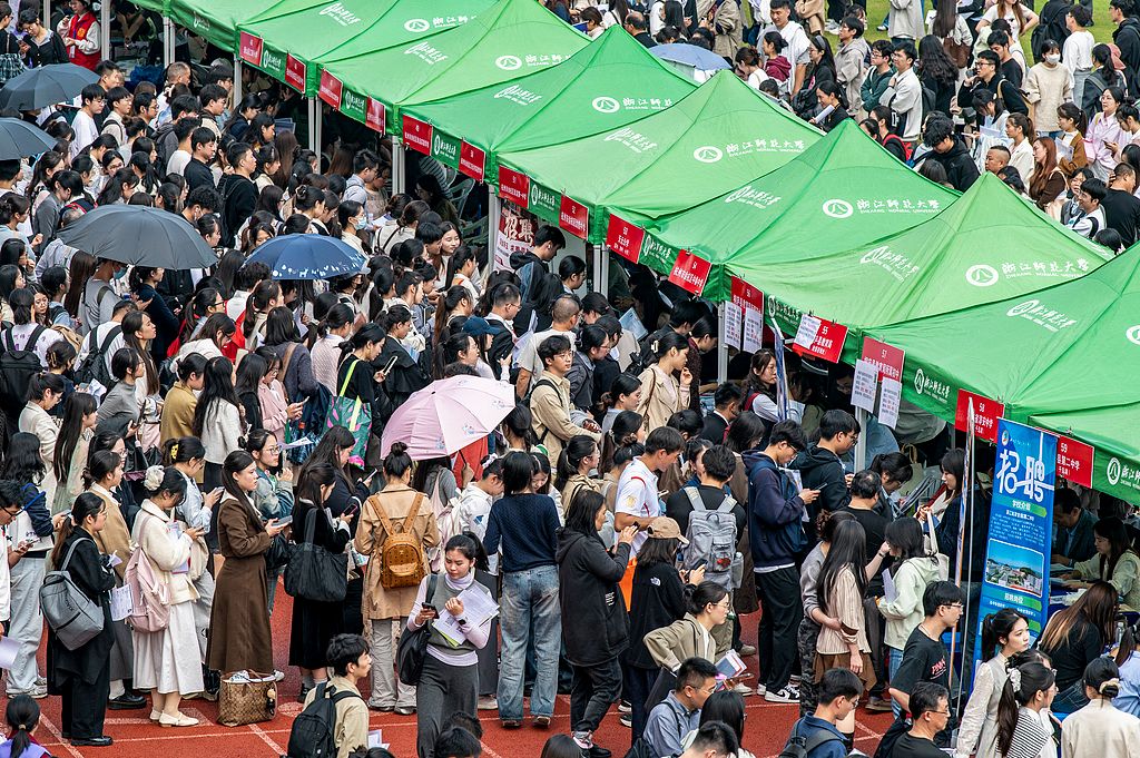 2025年11月8日,位于浙江省金华市的浙江师范大学校园里,大学生在师范类专场招聘会上排队应聘就业岗位。