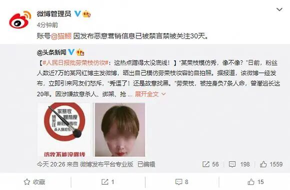 一个粉丝6万多、认证为“颜值博主”的账号在微博中配图发文,“某荣枝的模仿秀,像不像”。最终,该博主被平台禁言处理。