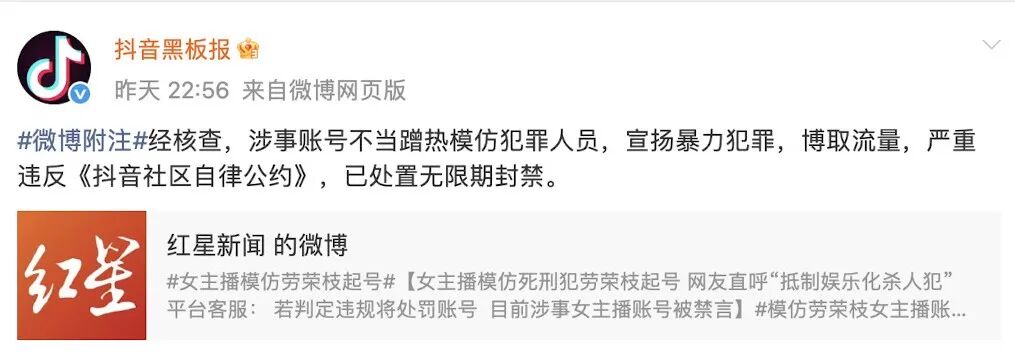 11月7日晚,抖音黑板报官方微博发文称,经核查,涉事账号不当蹭热模仿犯罪人员,宣扬暴力犯罪,博取流量,严重违反《抖音社区自律公约》,已处置无限期封禁。