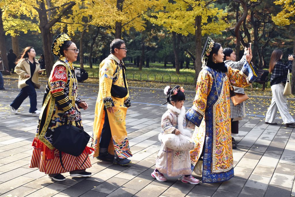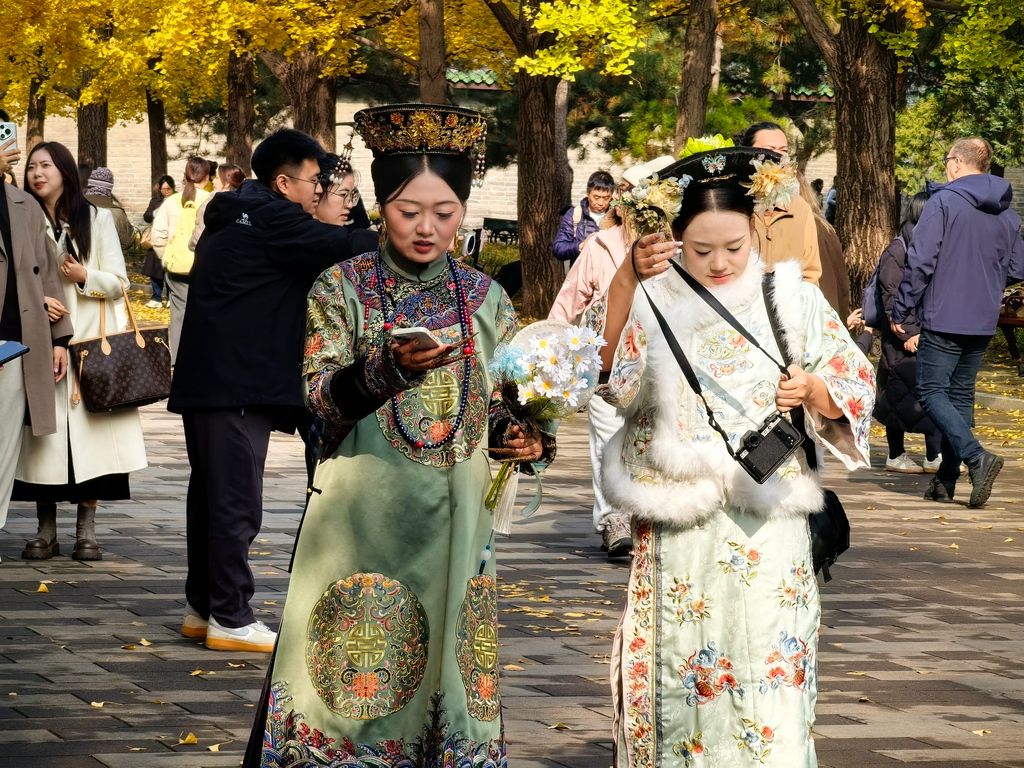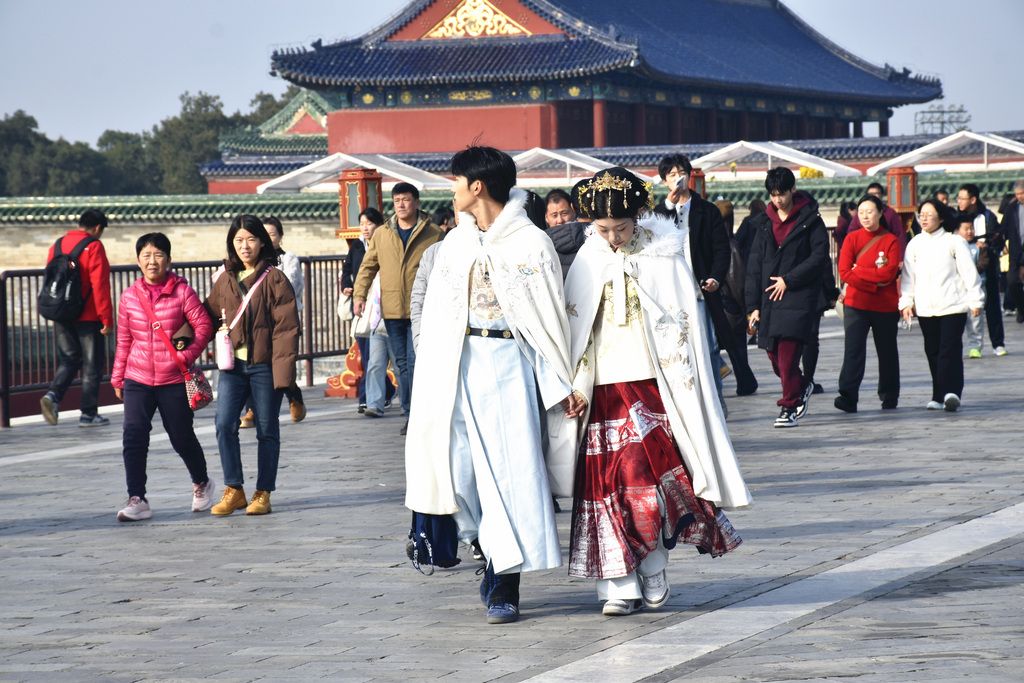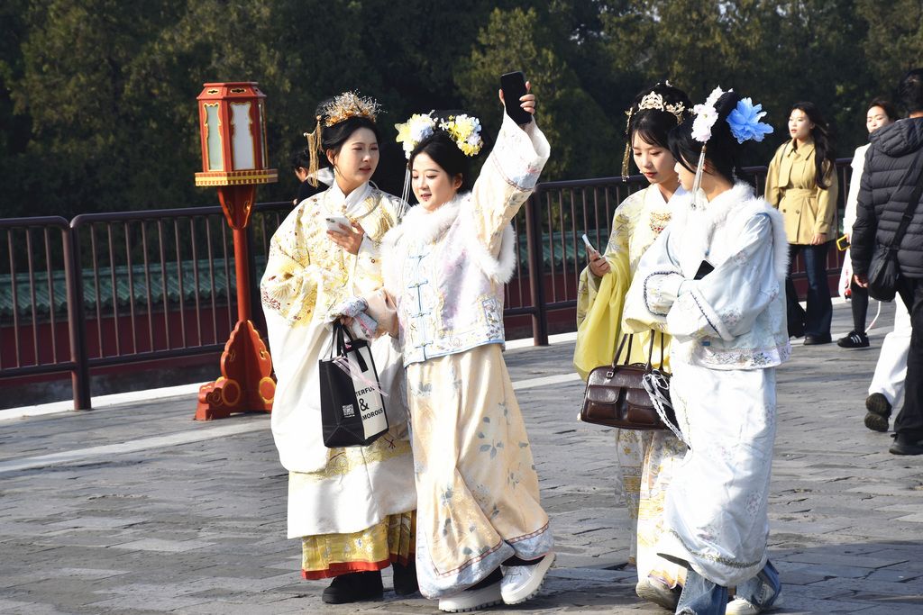 2025年11月8日,北京,天坛公园冬日风光烂漫,游客身着古装“穿越”游天坛公园,欣赏初冬美好时光,展国风国潮服饰魅力,成为一道独特的文旅新风景。