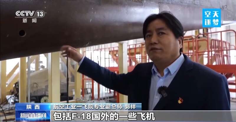 航空工业一飞院专业副总师 郭祥:对,歼-15T、歼-35,包括F-18,国外的一些飞机,他们基本上就的构型折叠,就垂直向上的折叠,我们飞机就像跳舞一样,因为是这样折叠就跟舞蹈一样,扇形的折叠。