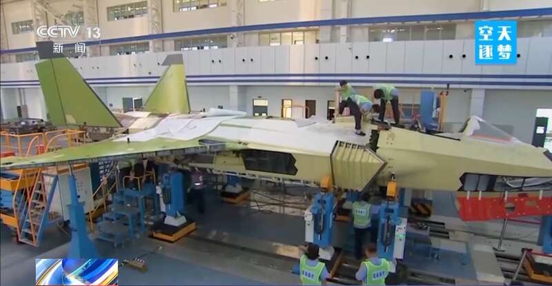 总台央视记者 李宁:这是一架正在生产中的歼-35,它是我国自主研制的最新一代的隐身舰载战斗机,它采用一体化设计,单座双发外倾双垂尾,是一款舰载多用途战斗机,它主要是以制空作战为主,兼顾对面作战。