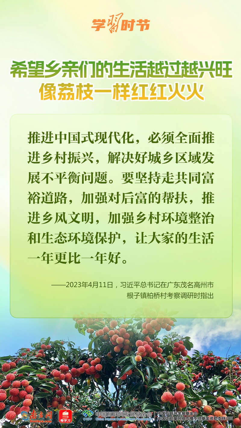 党的二十大后,习近平总书记两次考察广东,分别走进粤西、粤北的乡村田间。在茂名柏桥村的古荔树下、梅州南福村的金柚基地里,总书记亲切问询特色产业发展情况,饱含对乡村振兴的殷切期盼,也传递着对农民增收致富的甜美祝愿。