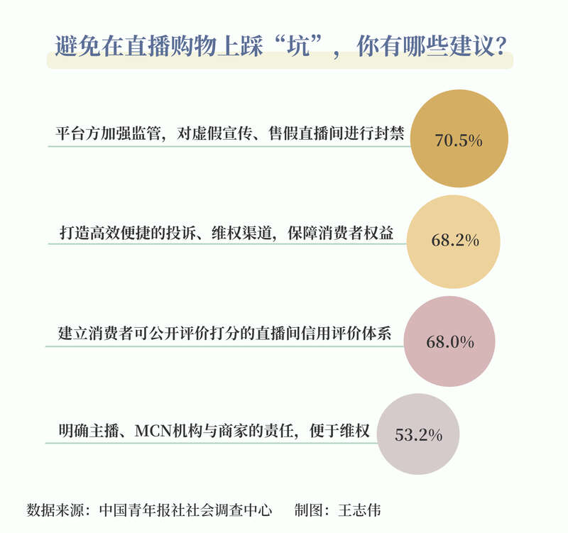 避免在直播购物上踩“坑”,70.5%的受访者希望平台方加强监管,对虚假宣传、售假直播间进行封禁,68.2%的受访者期待打造高效便捷的投诉、维权渠道,保障消费者权益,68.0%的受访者建议建立消费者可公开评价打分的直播间信用评价体系,53.2%的受访者期待明确主播、MCN机构与商家的责任,便于维权,35.0%的受访者表示消费者个人要提高辨别意识,理性消费。