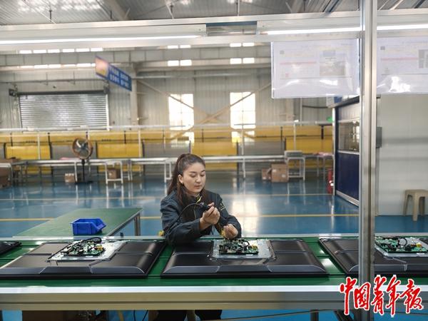 2023年,出口加工液晶显示器的喀什康意智能科技有限公司(以下简称“康意智能”)落地喀什片区后,带动了附近许多村民在家门口就业。经村民介绍,布阿依夏穆·艾尼来到康意智能的工厂,负责液晶显示屏的组装。她虽然没有工厂经验,但上岗前参加了专业培训,很快就能上手,“现在拿到的工资比之前还多,每天8个小时的工作加上双休,照顾孩子也很方便。”