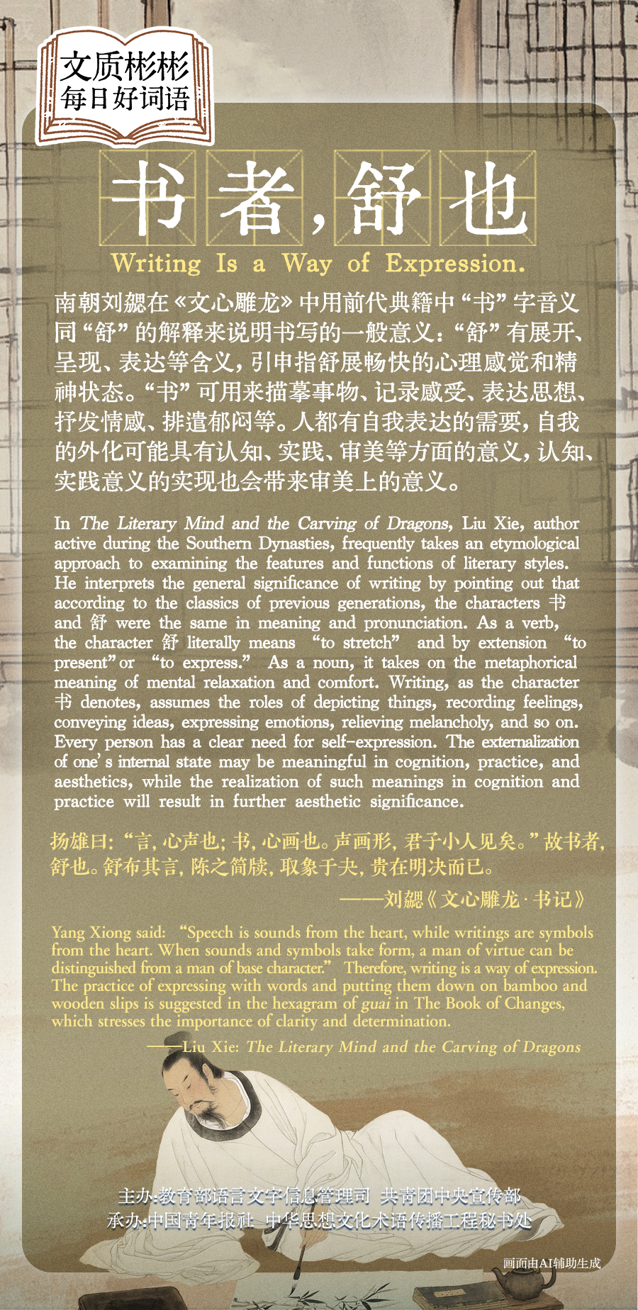 To write is to record and release events, ideas, and feelings by means of written words. Shu (书) literally means "to write" and by extension "written works." In the context of traditional Chinese culture, written works include all letters, notes, essays, calligraphic works, and books. In The Literary Mind and the Carving of Dragons, Liu Xie, author active during the Southern Dynasties, frequently takes an etymological approach to examining the features and functions of literary styles. He interprets the general significance of writing by pointing out that according to the classics of previous generations, the characters "书" and "舒" were the same in meaning and pronunciation. As a verb, the character "舒" literally means "to stretch" and by extension "to present" or "to express." As a noun, it takes on the metaphorical meaning of mental relaxation and comfort. Writing, as the character "书" denotes, assumes the roles of depicting things, recording feelings, conveying ideas, expressing emotions, relieving melancholy, and so on. Every person has a clear need for self-expression. The externalization of one's internal state may be meaningful in cognition, practice, and aesthetics, while the realization of such meanings in cognition and practice will result in further aesthetic significance. Starting from the original meanings of the characters, Liu proceeds to affirm the essential significance of all literary styles and means of literary and artistic expressions, summarizes the basic functions of writing and literary and artistic creation, and in a broader sense emphasizes the aesthetic features of writing and the aesthetic need of humanity. His views mark the initial self-awareness of Chinese literary theory.
